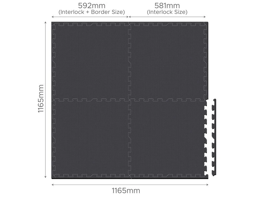 Hver plade måler 59,2 x 58,1 cm, og samlet måler sættet 116,5 x 116,5 cm.