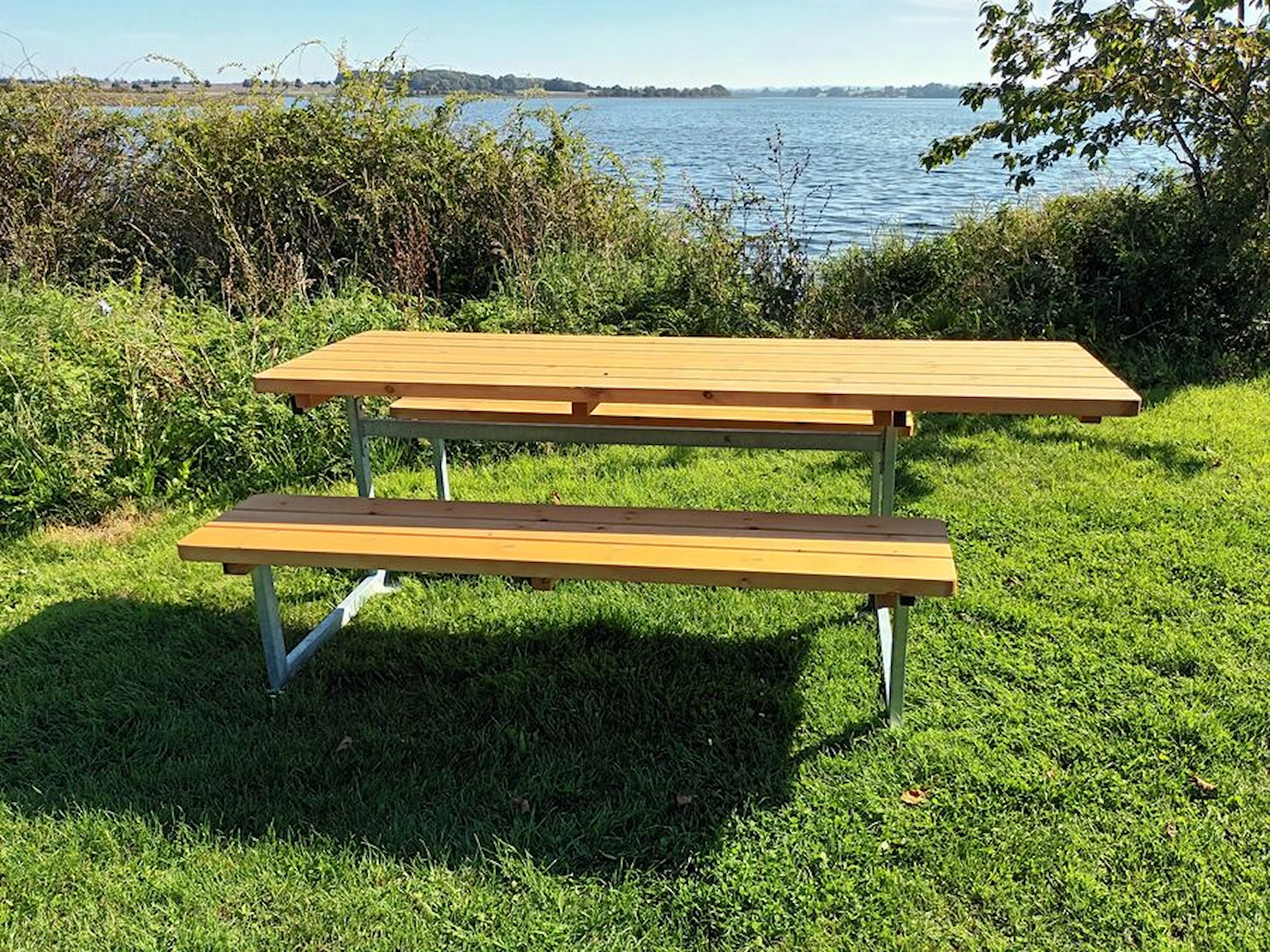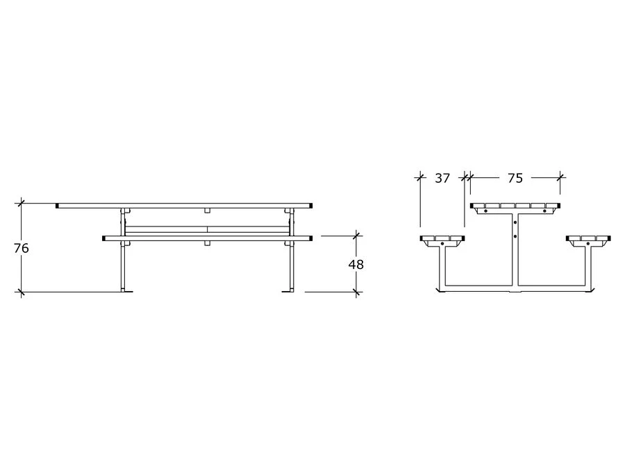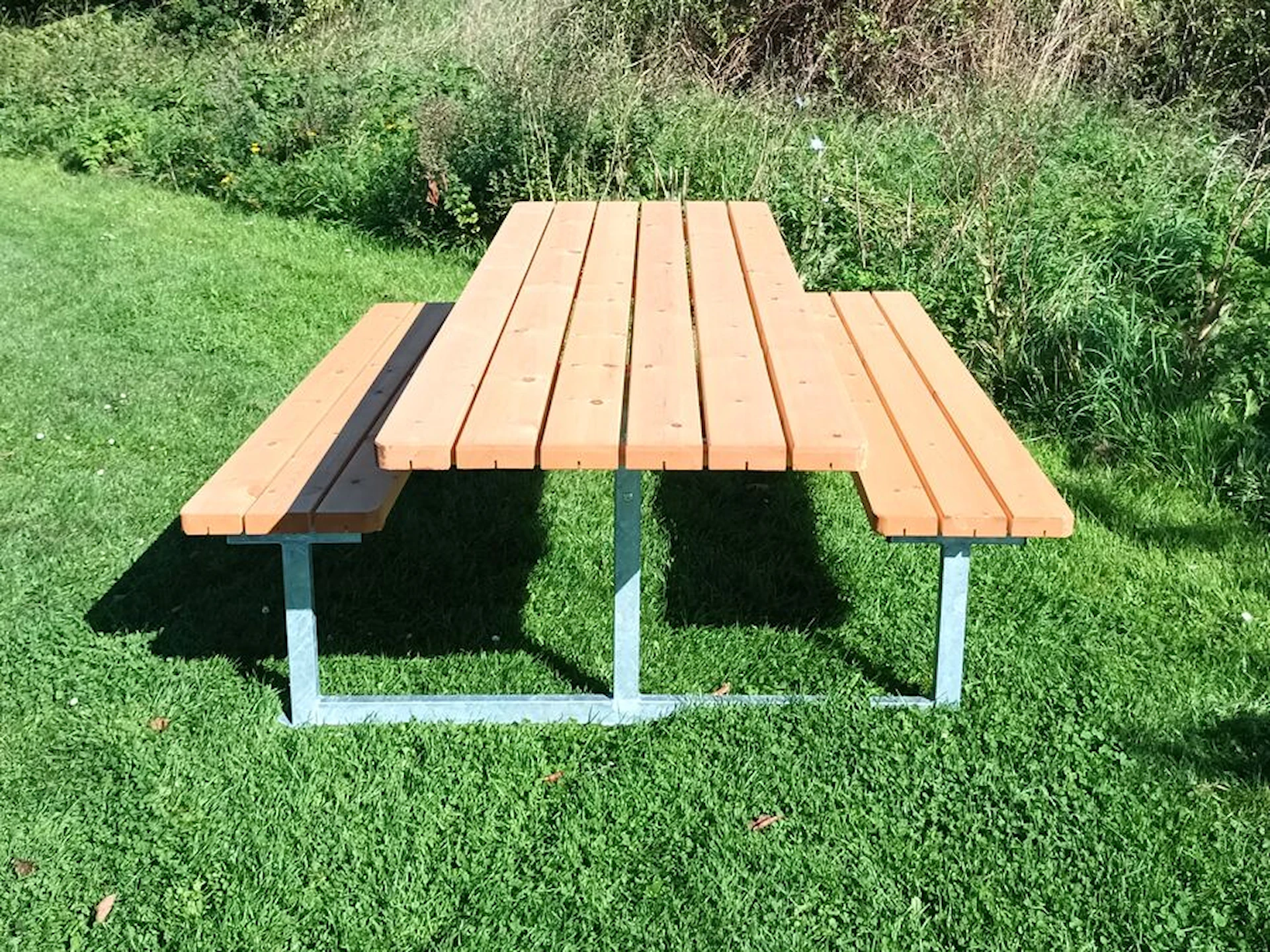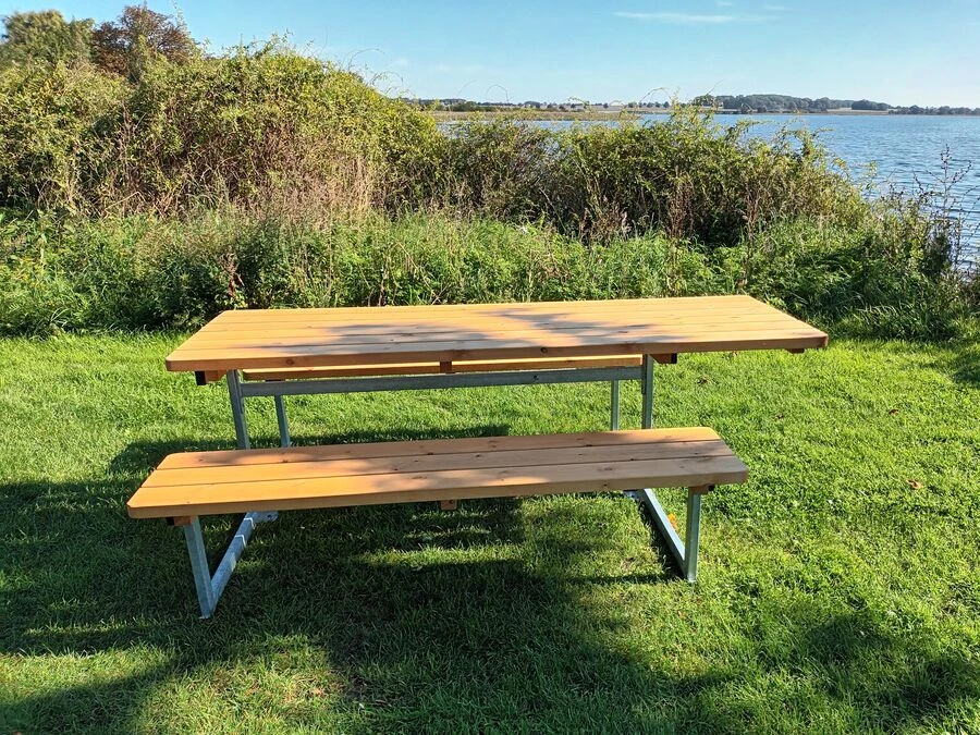 Stellet består af varmgalvaniserede stålprofiler i Ø50 mm. Plankerne er i svensk nordlandsfyr. Bordpladen måler 220 cm i længden, bænkene 180 cm, og den samlede dybde er 200 cm. Bordpladen består af seks planker, sæderne af tre planker og ryglænene af to planker. Sæde, ryg og bordplade leveres samlede med afrundede hjørner.