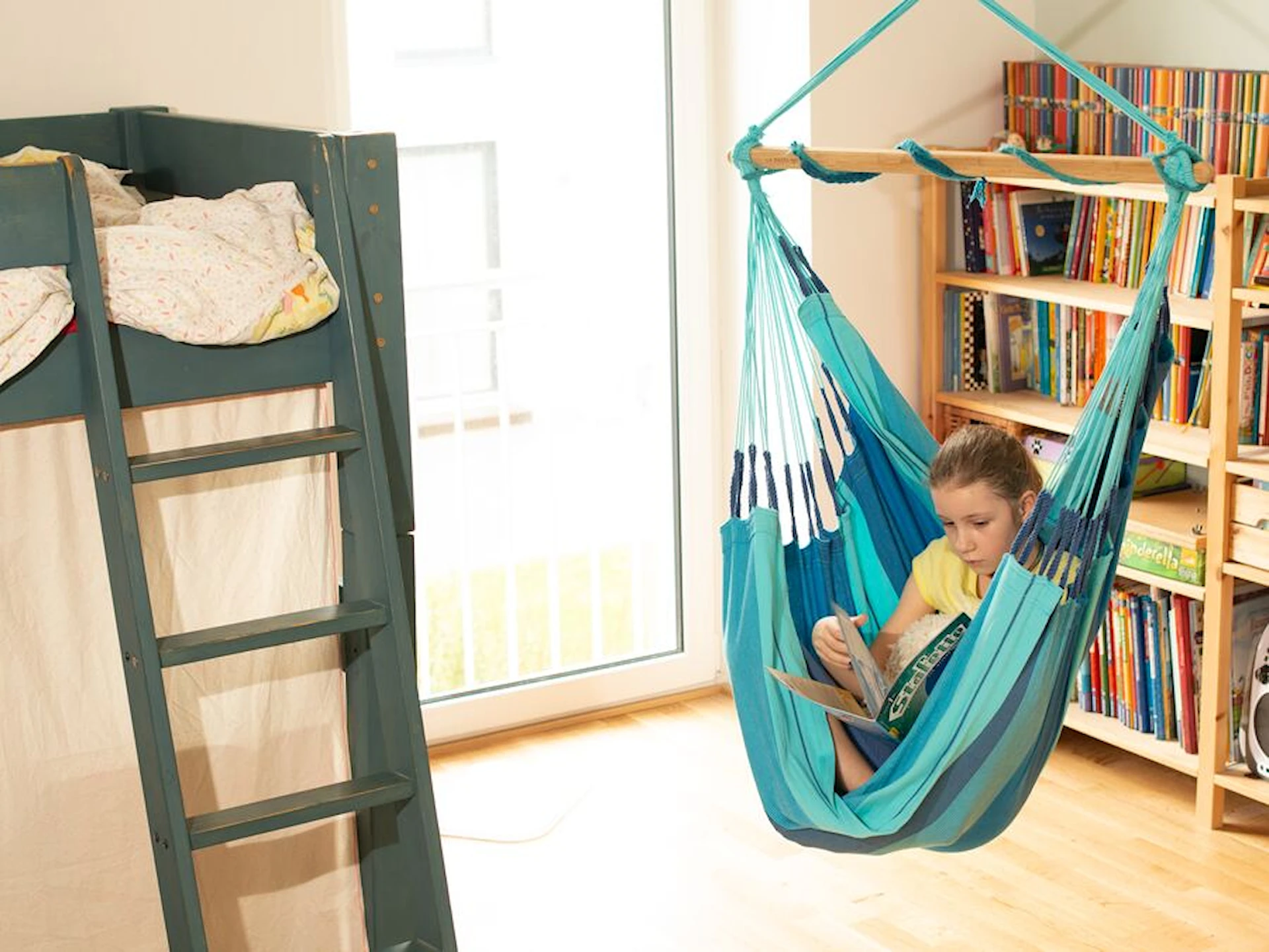 Denne hængestol er designet med børn og voksne i tankerne og skaber en hyggelig oase, hvor man kan slappe af og nyde rolige stunder. Stolen passer perfekt ind i institutioner, hvor man ønsker at tilbyde et sted til fordybelse og hvile.