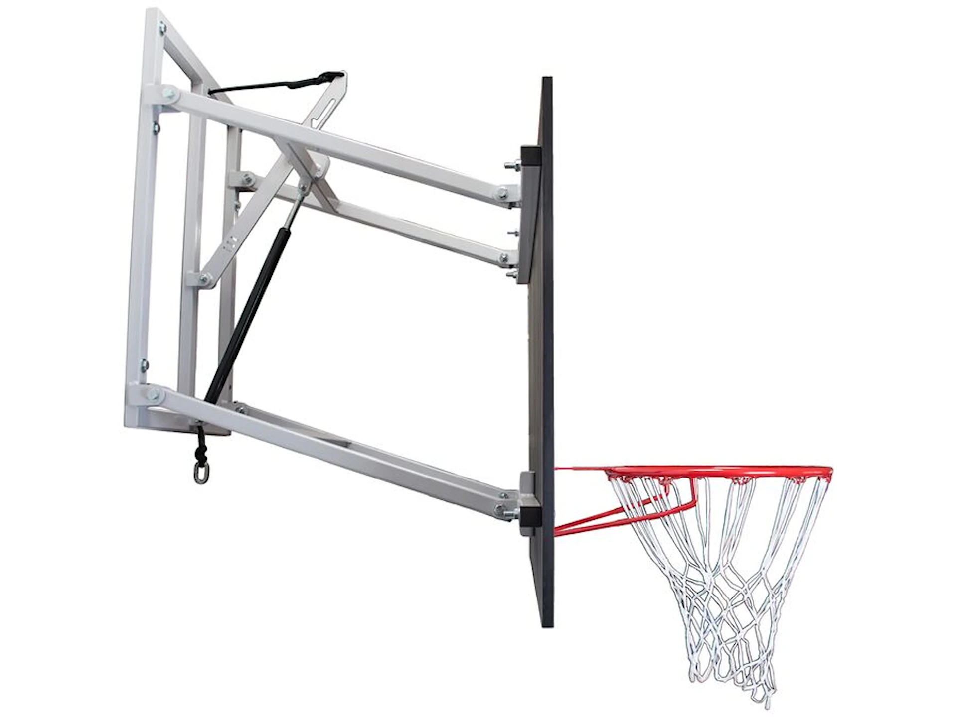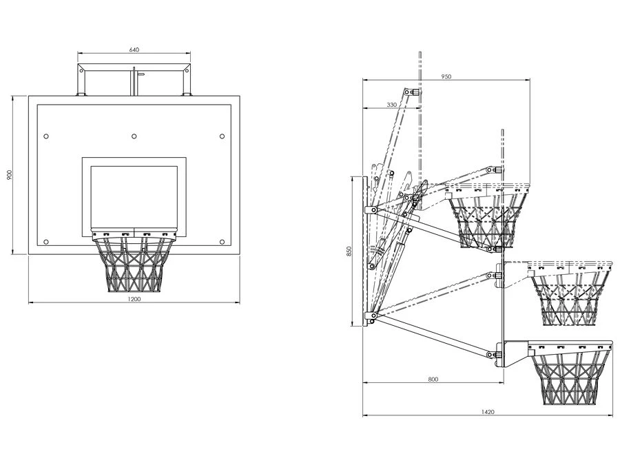 Udhænget fås i to dybder, hvor basketballpladen er enten 80 cm eller 120 cm fra væggen i udslået tilstand. Begge modeller justeres nemt mellem mini- og normalhøjde med en gasfjeder og kan indstilles i tre højder i alt: 260 cm, 305 cm og fuld sammenklappet.