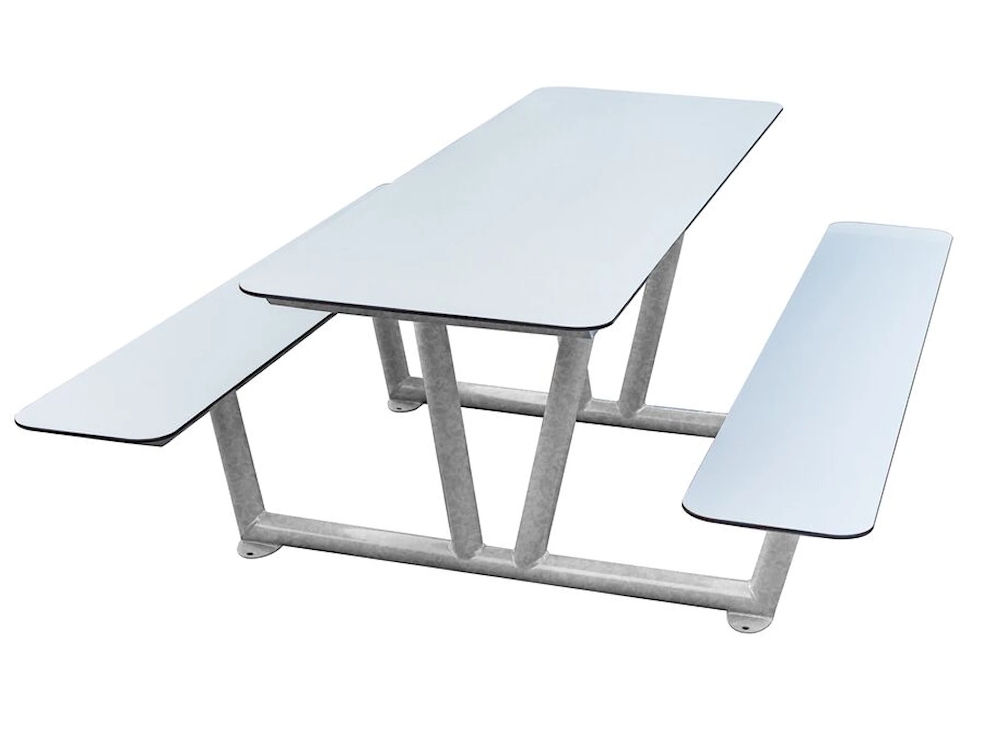 Bordplade og sæder er fremstillet af 9 mm vejrbestandig melaminplast, som kræver minimal vedligeholdelse og tåler helårsbrug. Pladerne er fastgjort til stellet og har afrundede kanter for øget komfort og sikkerhed.