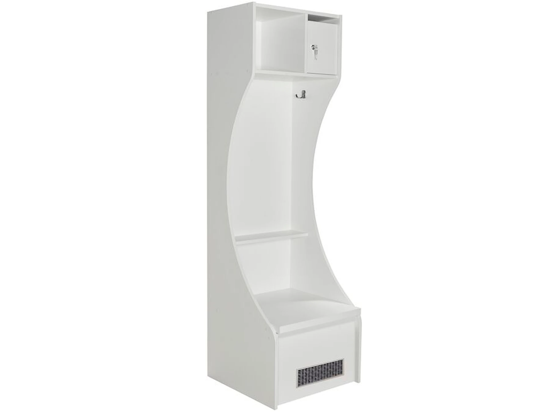 Bænken er udstyret med et aflåseligt værdiskab til personlige ejendele, to opbevaringshylder og to dobbelthængte knager.