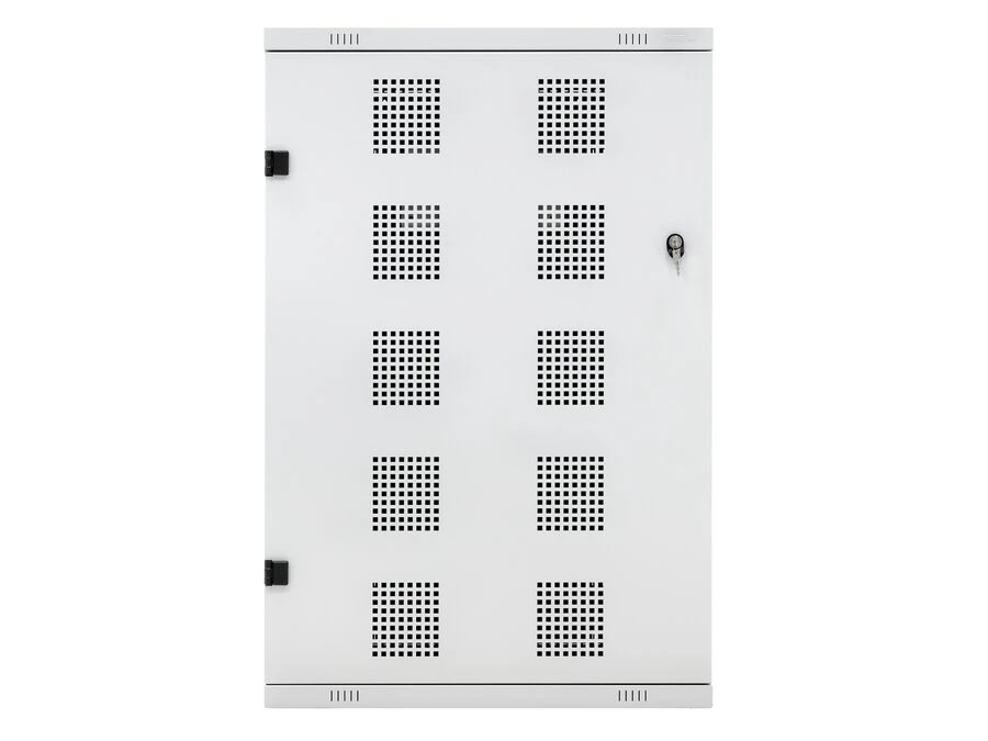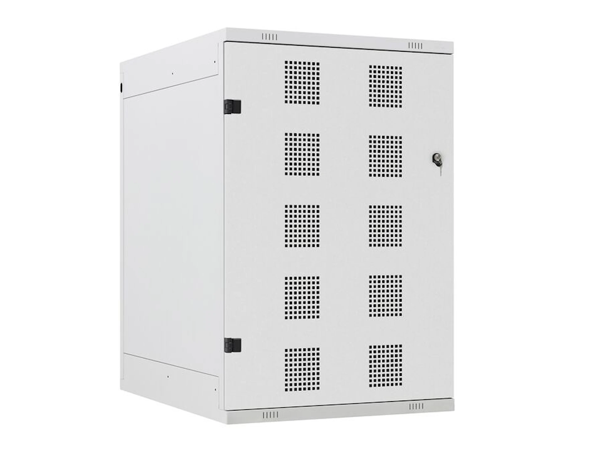 Skabet har perforerede flader, der sikrer god ventilation. Indvendigt er der en hylde med plads til opladning af udstyr. På bagsiden findes et udgangshul til kabelføring, så der kan etableres strøm eller lys i skabet. En stålbeholder i lågen giver ekstra plads til småting.