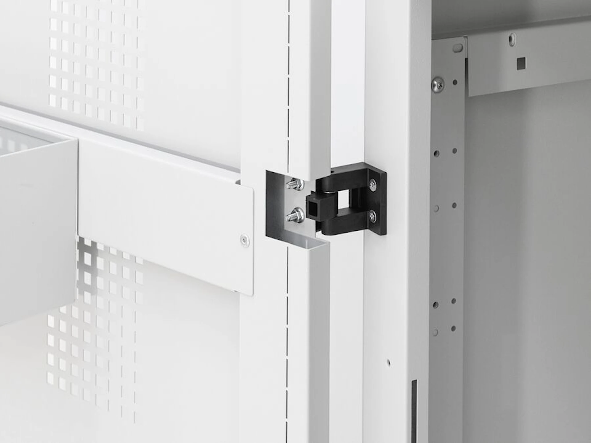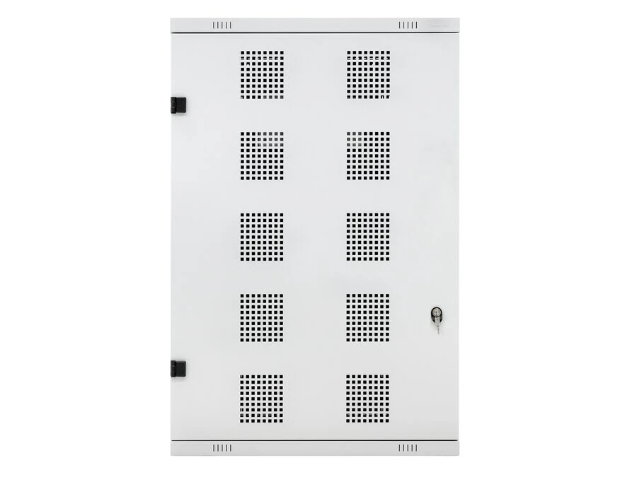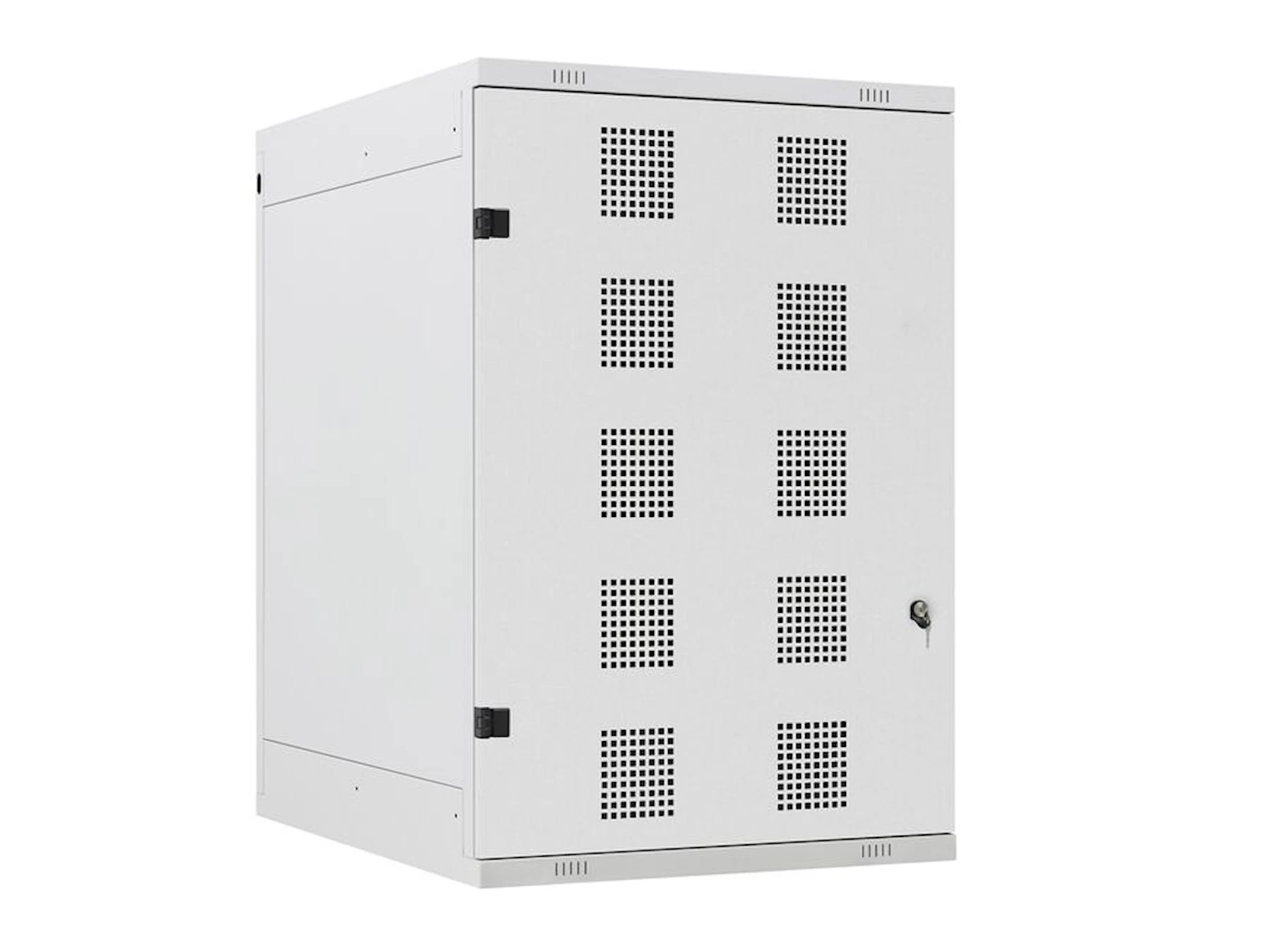 Skabet har perforerede flader, der sikrer god ventilation. Indvendigt er der en hylde med plads til opladning af udstyr. På bagsiden findes et udgangshul til kabelføring, så der kan etableres strøm eller lys i skabet. En stålbeholder i lågen giver ekstra plads til småting.