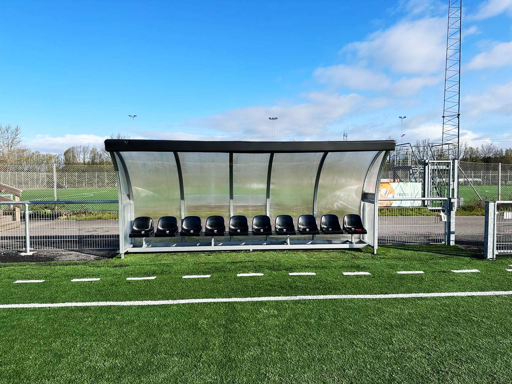 Én til hjemmeholdet og én til gæsterne. En stabil udskiftningsboks, som beskytter spillerne mod vind og vejr. Sæderne har en behagelig ryglænshøjde og er produceret af brandhæmmende materialer.