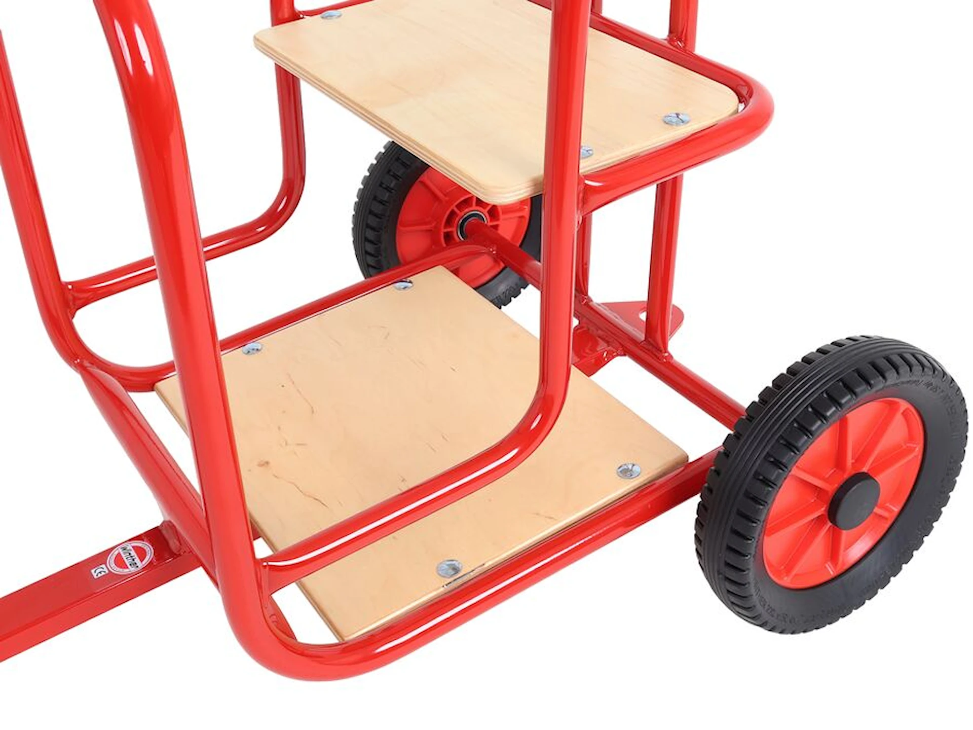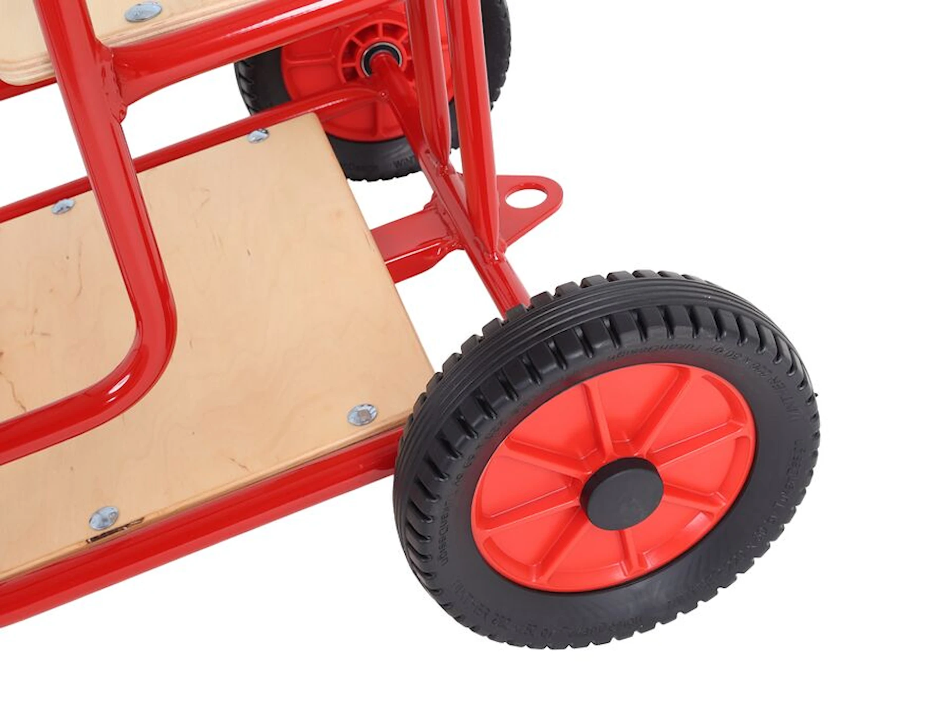 Sæde og bund er i lakeret træ og stellet er i pulverlakeret stål med høj modstandsdygtighed mod rust og slag. Hjulene er punkterfrie og fremstillet i slidstærkt gummi. Alle sliddele og reservedele kan bestilles ved behov.