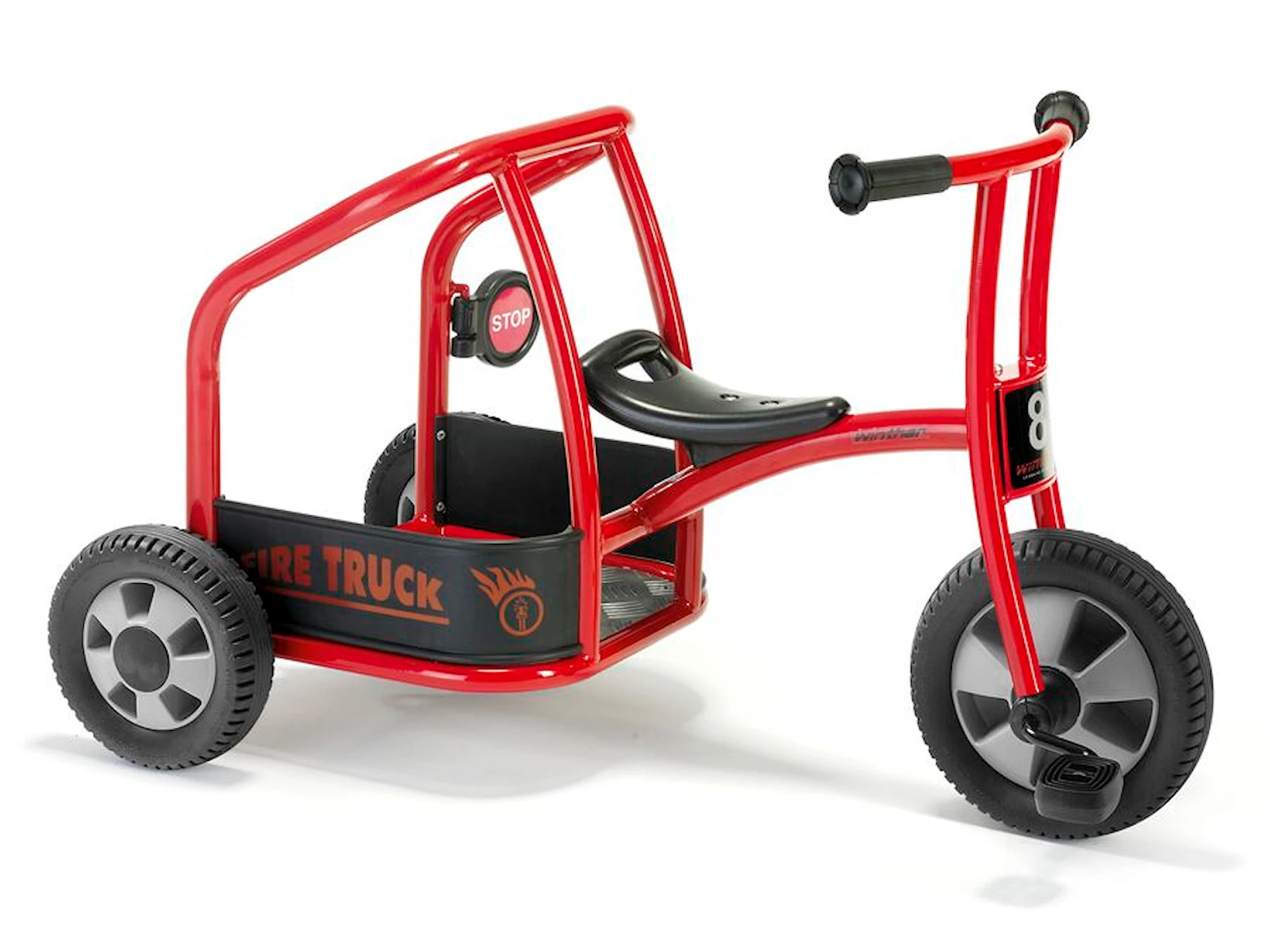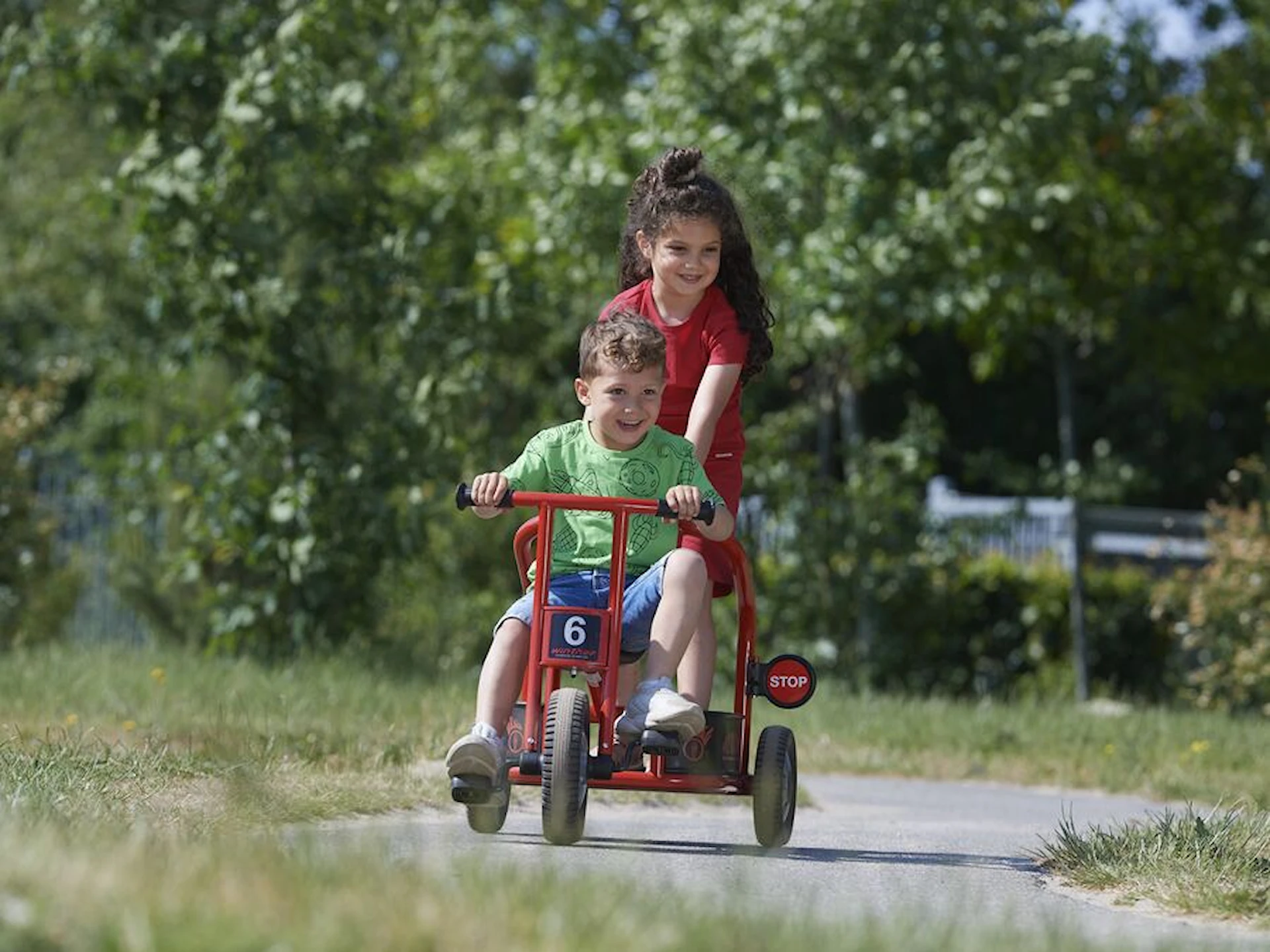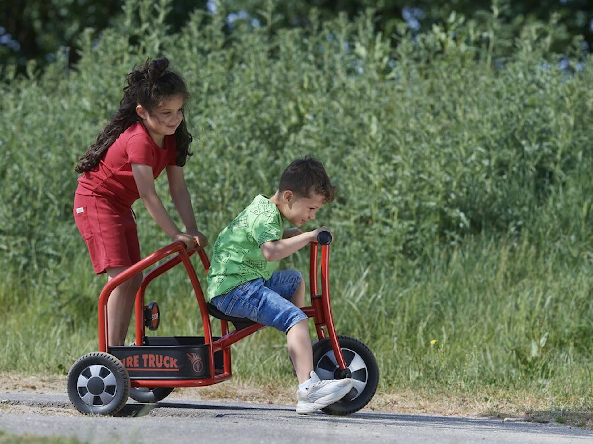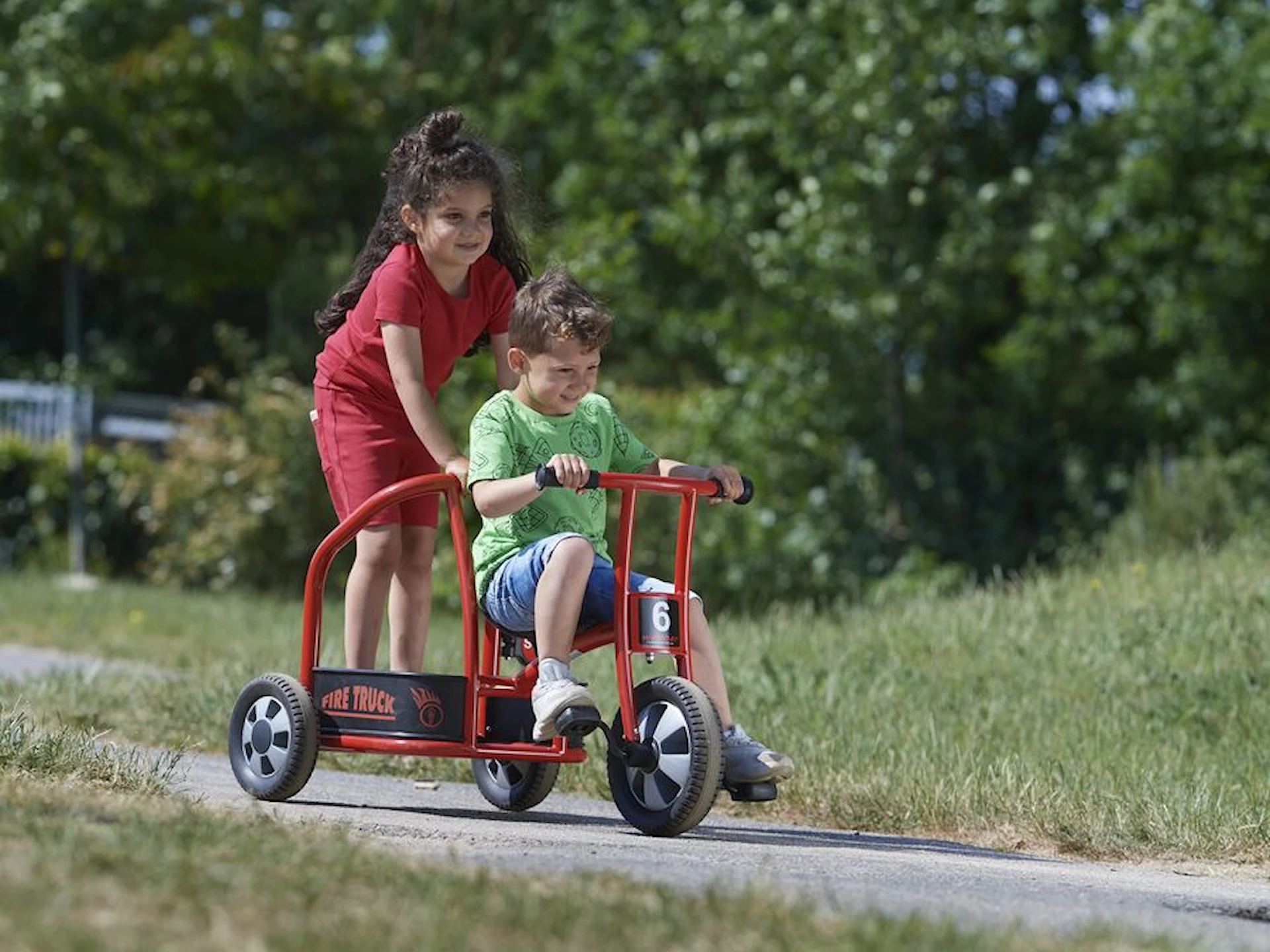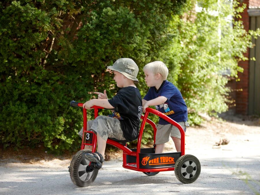 Cyklen har plads til to børn, så samarbejde og fantasi bliver en naturlig del af legen. Den ene styrer pedalerne, mens makkeren bagpå kan dirigere, holde udkig eller give ordrer fra “brandstationen”.