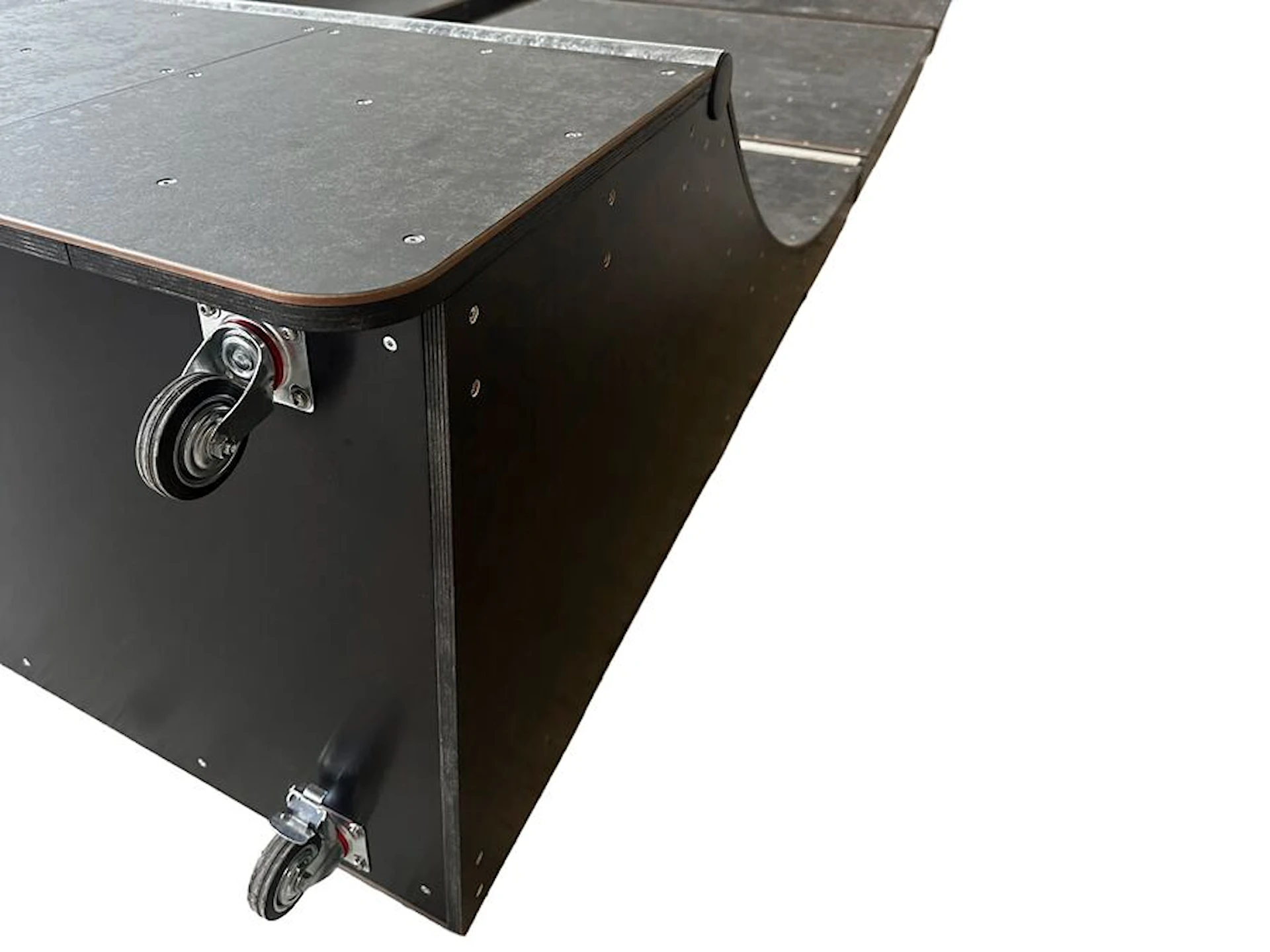 Når området skal brukes til andre aktiviteter, kan rampens deler enkelt vippes opp og rulles til oppbevaring under tak eller i garasje. Konstruksjonen er bygget for å tåle det skandinaviske været, med værbestandige komposittplater og kantforseglet kryssfiner.