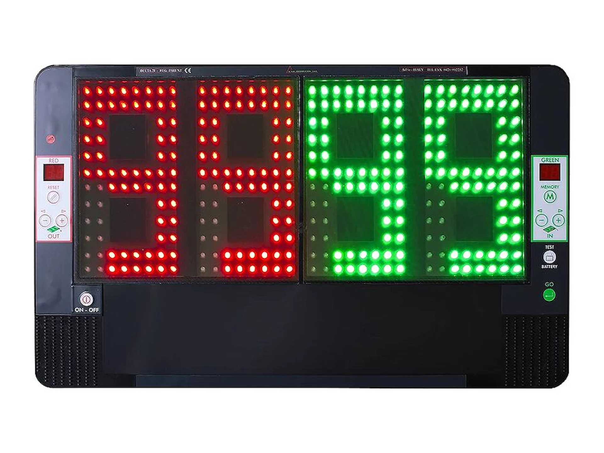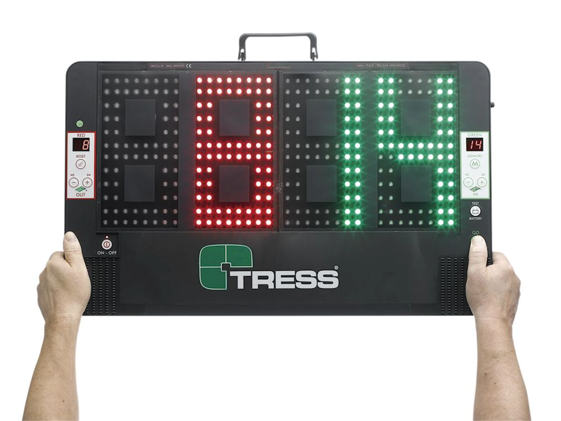 Delta 2F är tillverkad i stöttålig ABS-plast och är vattentålig, vilket gör den användbar i alla väder – även regn. Batteriet är uppladdningsbart utan litium för ökad säkerhet och laddas fullt på endast 60 minuter. Tavlan levereras med en praktisk bärväska för smidig transport till och från matcher.