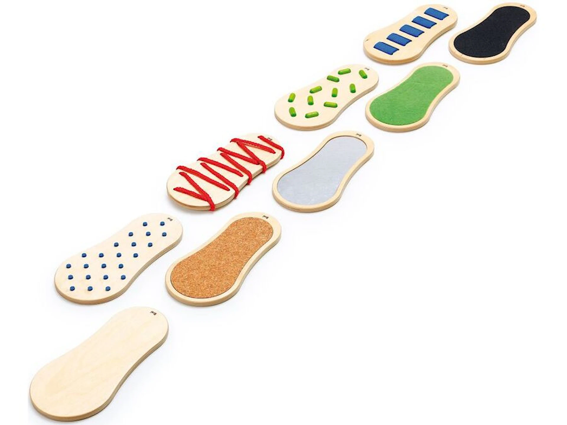 Setet innehåller 9 fötter med olika ytstrukturer. Varje fot är 28 x 14 x 2,26 cm.