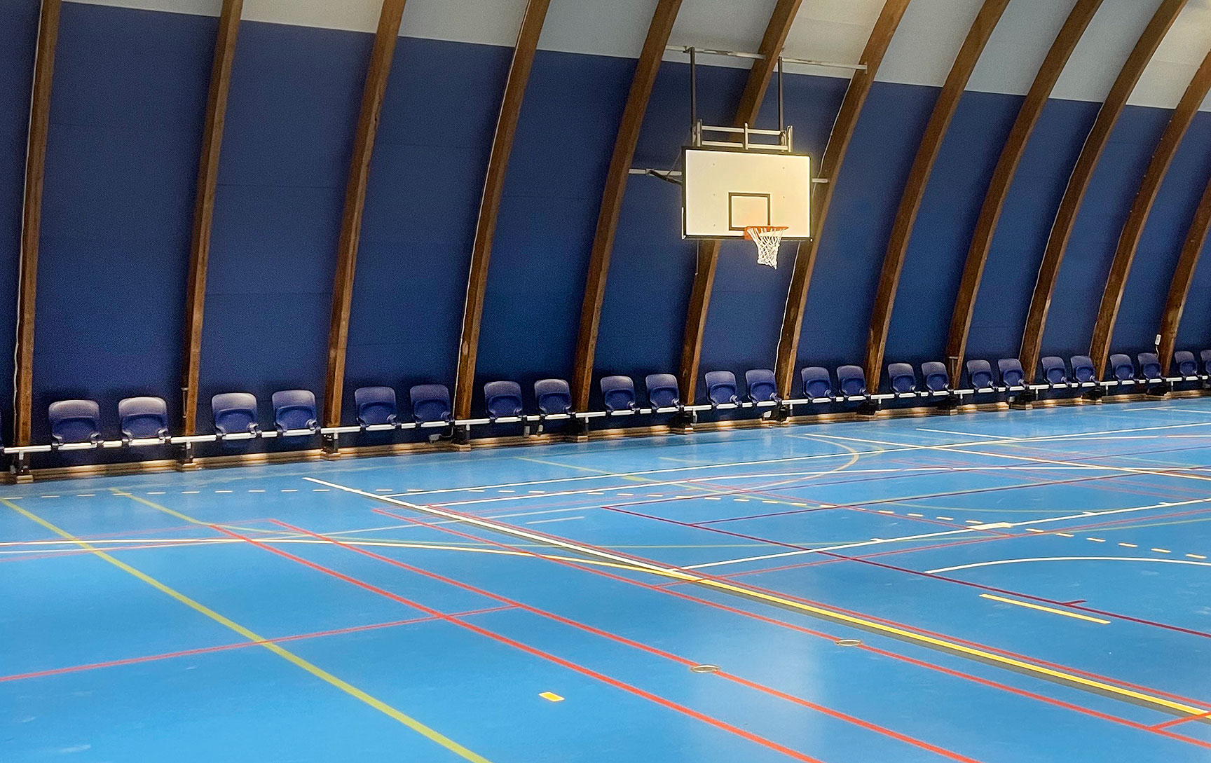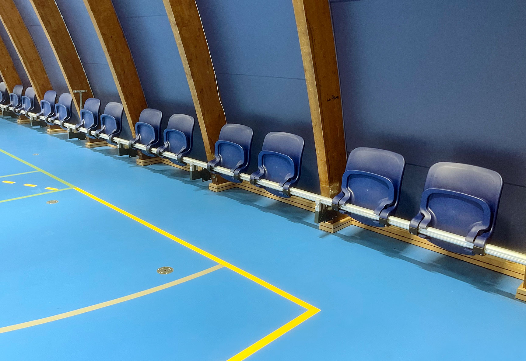 Vi har levererat totalt 720 nya läktarstolar till Glostrup Hallen. Alla i samma fina blåa RAL-färg.