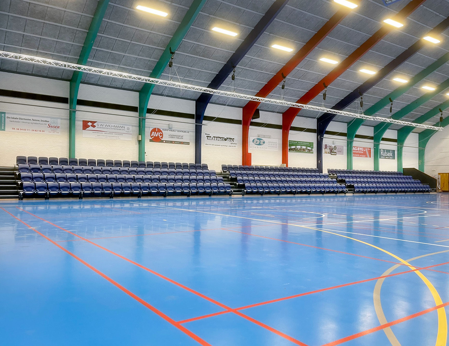 I Glostrup Hallen har Tress levererat totalt 720 nya läktarstolar till idrottsanläggningens tre hallar. I Hall 1 byttes de befintliga 512 läktarstolarna ut. Och så monterades 104 nya stolar i Hall 2 och 104 nya stolar i Hall 3.