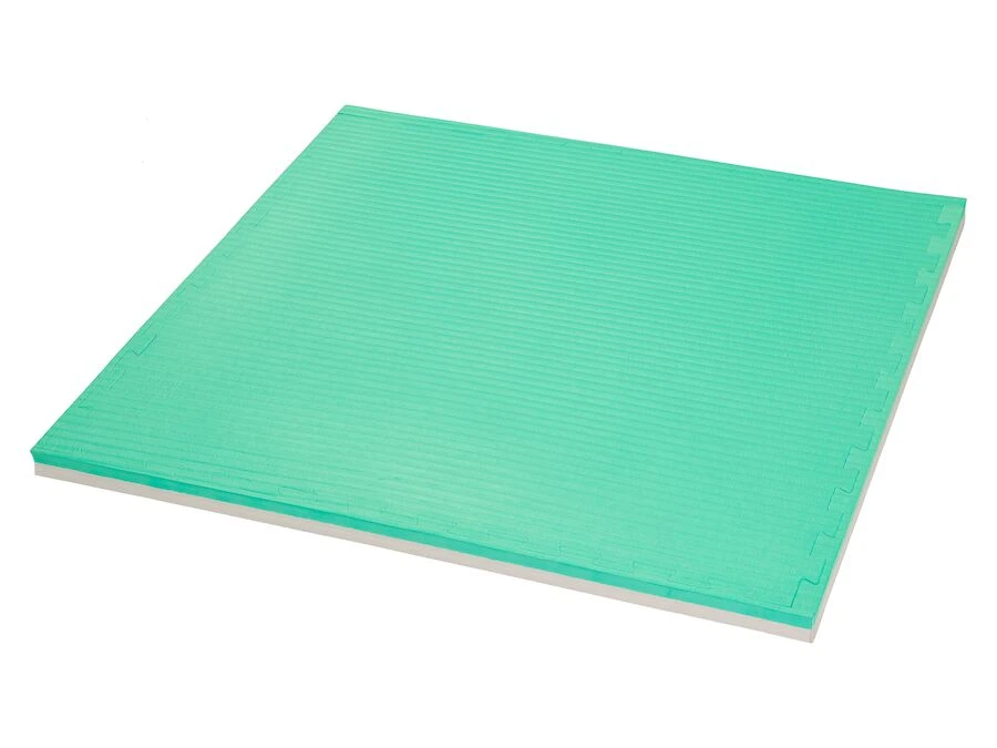 Med taggiga kanter som en pusselbit är det enkelt att montera ihop flera mattor för att täcka ett större område. Fogarna är täta och kan avslutas med de medföljande kanterna för en snygg finish. Med kantfinish mäter mattan 102 x 102 cm. Tjockleken är 40 mm (+/- 2 mm).