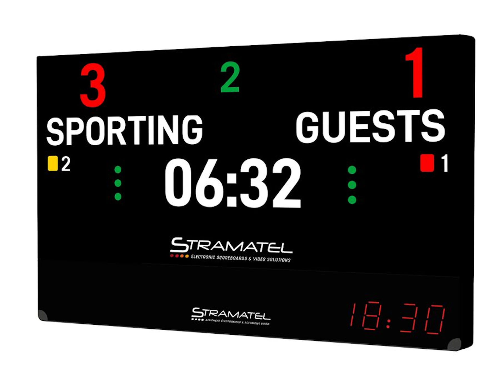 Den stora LED-videoskärmen återger resultat, partnerreklam och publikengagerande videoklipp med tydlig kontrast och hög synlighet även i direkt solljus. Med det inbyggda anslutningssystemet kan du enkelt ladda upp egna bilder, videor och sponsorbudskap som styrs via Stramatels FIBA-godkända kontrollpanel.